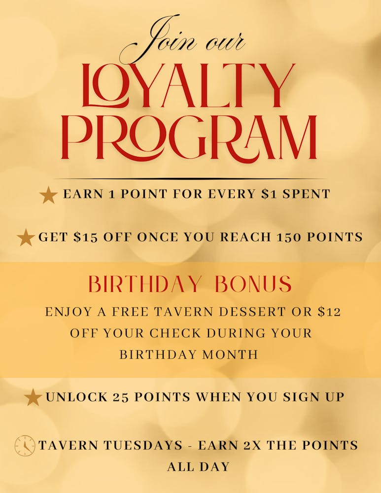 At Main Line Tavern we believe loyalty should be rewarded!! Our Loyalty Program lets you earn points every time you dine with us - and the best part? Your points never expire!! Start earning today, click HERE to sign up!